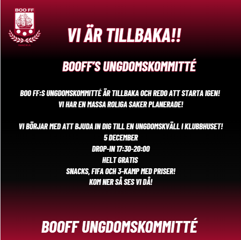 Boo FF:s Ungdomskommitté startar upp igen och vill gärna välkomna just dig till vår ungdomskväll här på Boovallen!