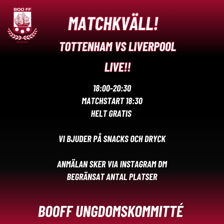 Boo FF:s Ungdomskommitté slår till igen med ännu ett evenemang! Denna gång är det en match kväll, matchen Liverpool ot Tottenham kommer att streamas på storbildsskärm! Matchen spelas lördag 20/12 kl 18:30 på Boovallen i Spelarummet (Nere), man kan vara på plats som tidigast 18:00, de bästa platserna försvinner snabbt så det gäller att vara i tid!